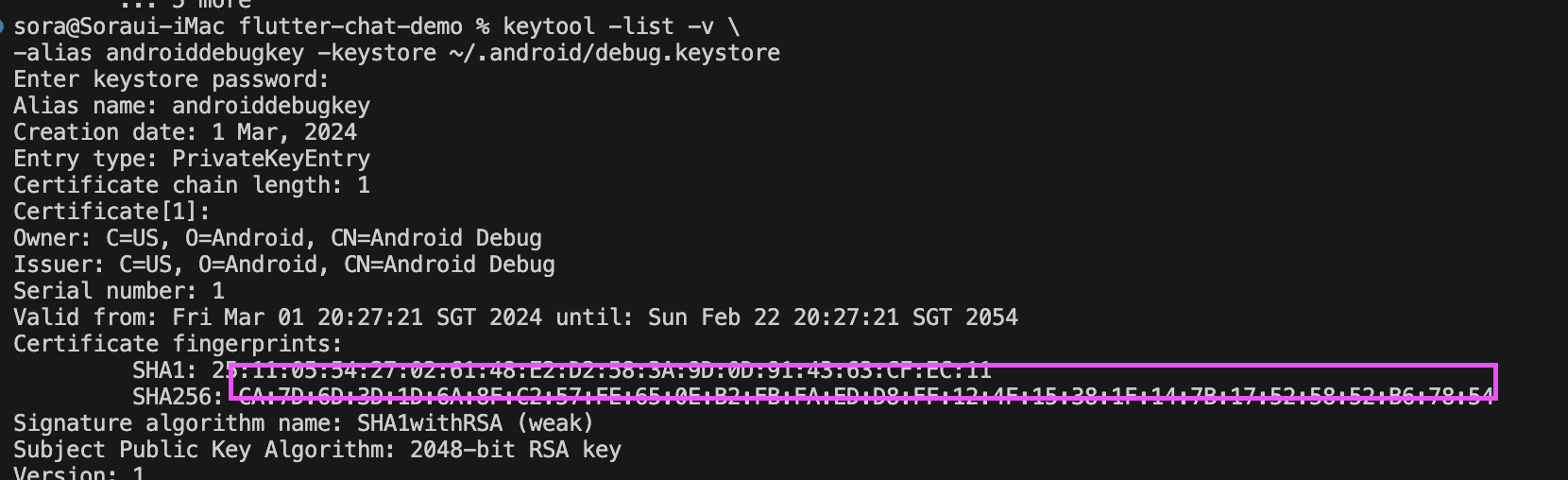 keytool -list -v \ -alias androiddebugkey -keystore ~/.android/debug.keystore //비밀번호 : android