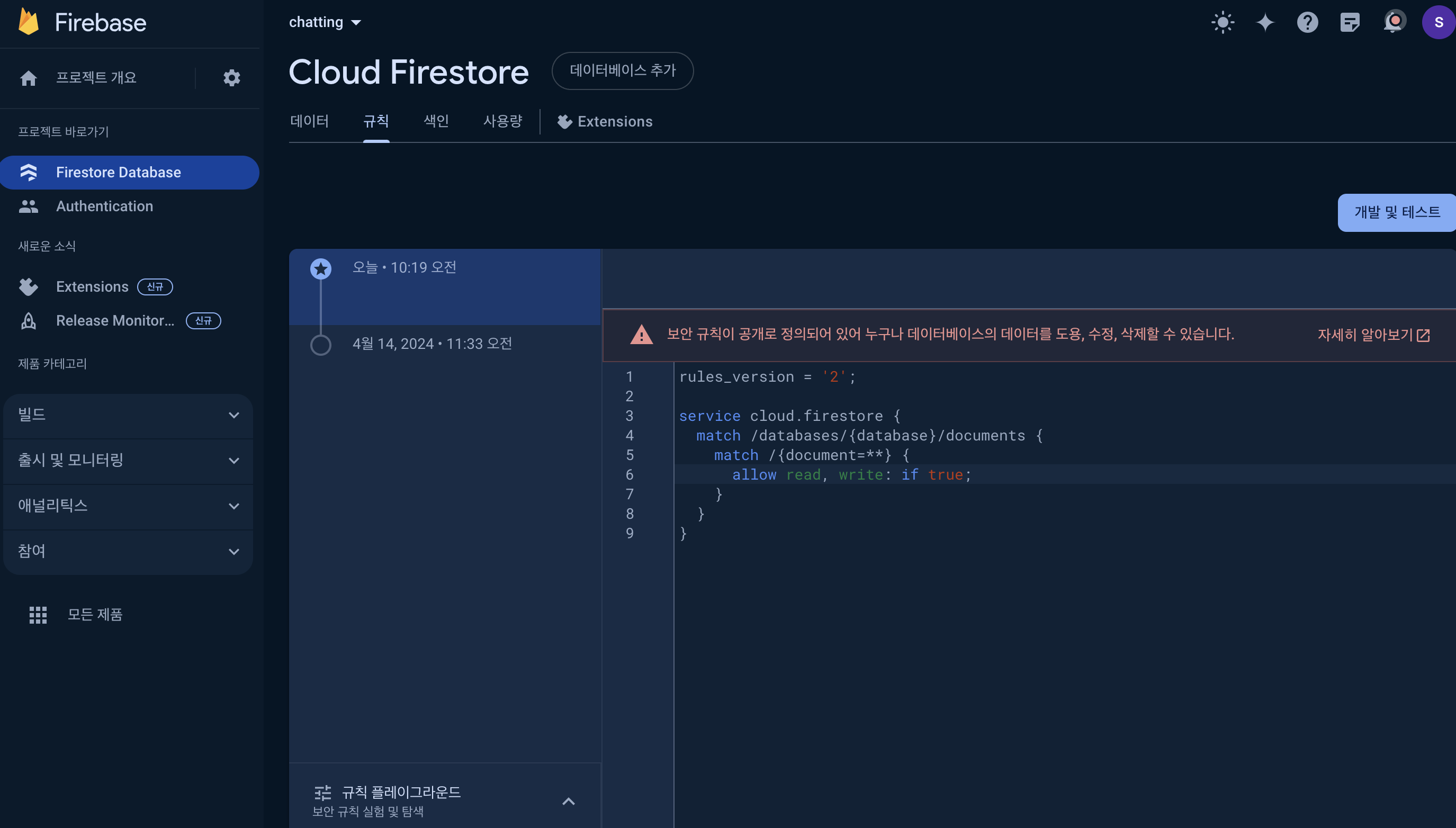 [플러터 오픈소스-채팅3] 파이어베이스 룰 변경하기개발시리즈 2024. 4. 21. 11:23