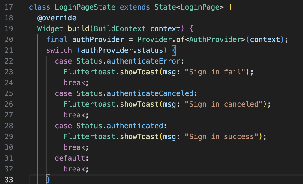 로그인 페이지 윗부분을 보면 이 코드라인이 있고, 이게바로 auth_provider에서 유저의 상태를 알려주는 걸 듣고 있다는 소리다.