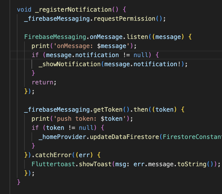 여기서 가장 중요하게 봐야할껀 바로 flutter_local_notifications 부분이다. 아래코드를 보면 알 수 있지만 토큰을 사용해서 유저의 기기를 등록한다(왜??? 노티피케이션 보내야하니까) .여기서 노티피케이션을 보내는 방법은 firebaseconsole에서 보내는거고. 만약 코드내에서 다른 사람이 채팅할때 노티피케이션을 보내려하면, extension링크를 통해 이부분을 작성해야한다.